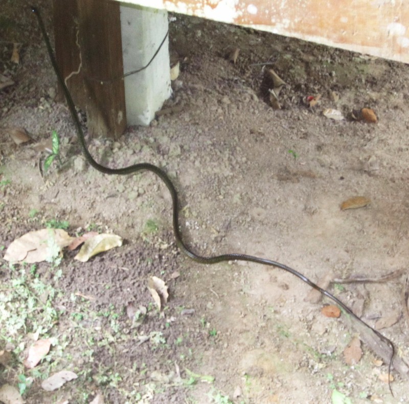 Next morning I met a new friend. I was drawing on the steps when a head popped up to the rightof me. An 8-foot tree snake.